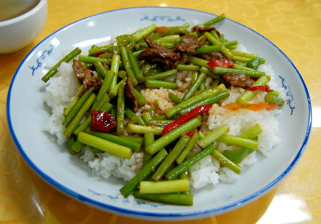 | Garlic stems and beef. This is from one of the many Chinese Muslim restaurants where they make hand pulled noodles and have picture menus on the walls. |